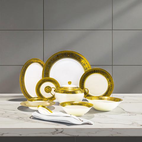 Juegos de vajilla de hueso nuevo de porcelana fina al por mayor de diseño personalizado chapado en oro de lujo 33 piezas Juego de sopera de sopa de cerámica con cuchara