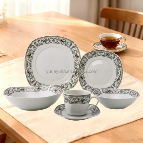 Juego de vajilla de porcelana de alta calidad personalizado con forma cuadrada de fábrica YDY, juegos de platos de cerámica con borde dorado, vajilla